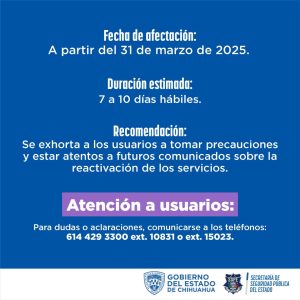 Al público en general se le informa sobre esta situación para tomar precauciones y estar atentos a futuros comunicados sobre la reactivación de los servicios de manera normalizada.