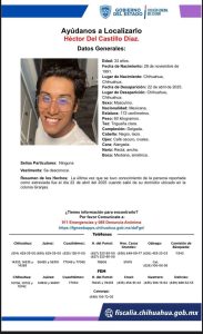 Chihuahua, Chih.- Continúa la búsqueda de Héctor Del Castillo Díaz, joven de 33 años reportado como desaparecido desde el pasado 22 de abril. Nuevos datos indican que al momento de su desaparición se encontraba trabajando como conductor de la plataforma Didi y habría tomado un viaje hacia Saucillo.